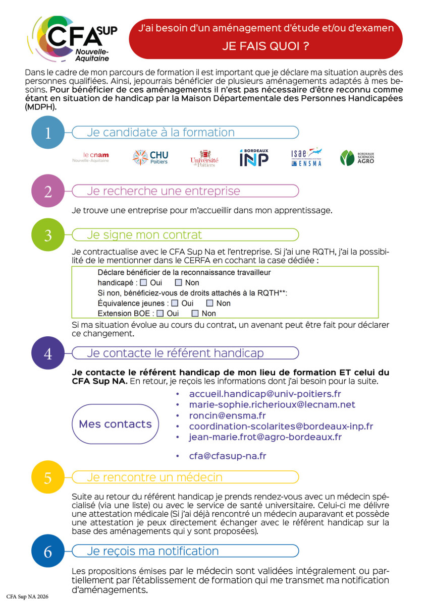 Un pôle handicap ou une personne qualifiée est présente dans chacun des établissements partenaires du CFA Sup NA. Pour connaître les conditions et accéder à des aménagements au sein de votre lieu de formation, il est nécessaire de contacter les chargés d'accueil. Vous pouvez solliciter ces différents contacts avant la rentrée et au cours de votre contrat, dès qu’un changement survient dans votre situation.